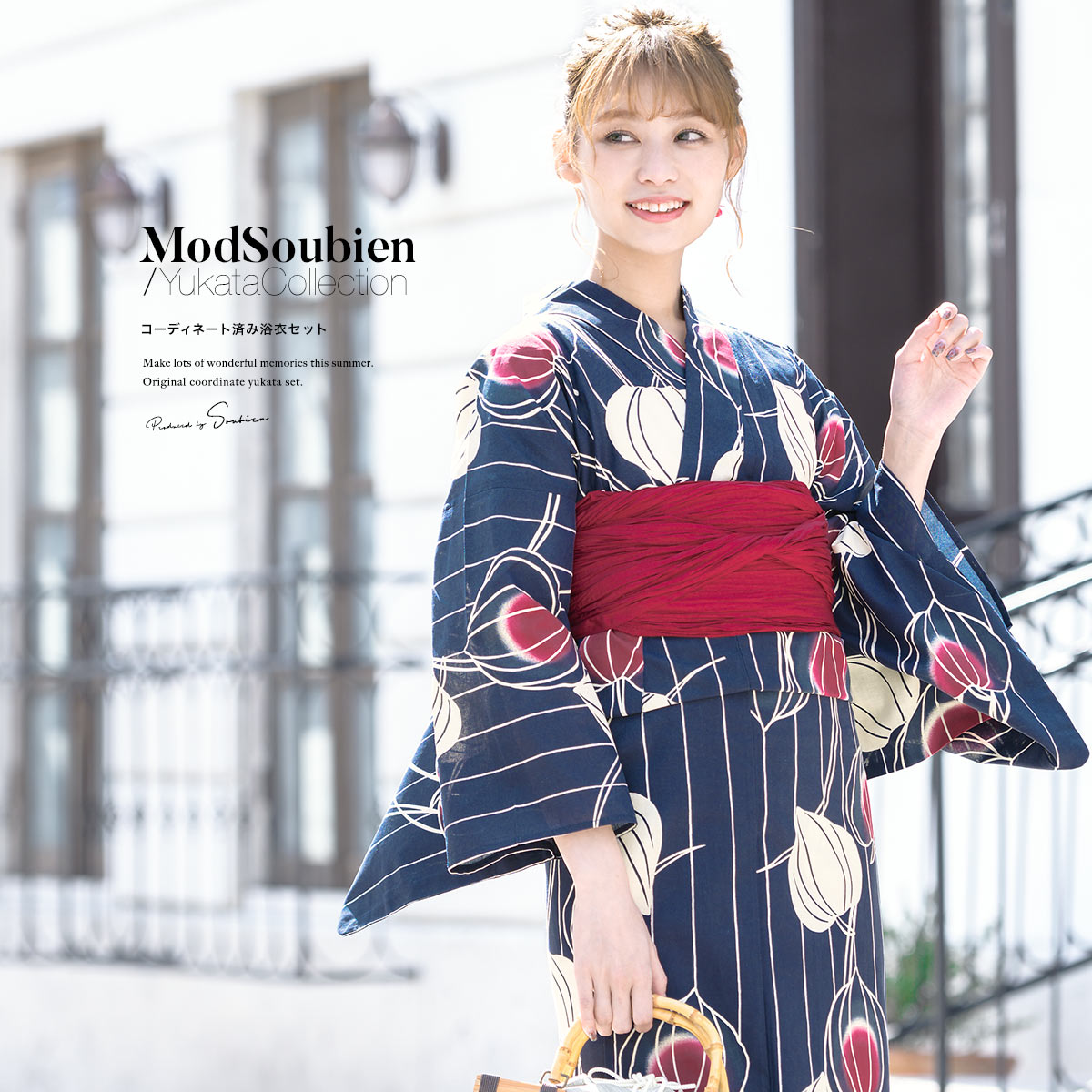 浴衣 レディース セット つけ帯 作り帯 兵児帯 2点 レトロ 2020 【オリジナル 個性派 高級 浴衣2点セット】ゆかた 古典 帯 鈴蘭 ストライプ レモン アザミ 鬼灯 レトロモダン お洒落 赤 白 水色 緑 くすみカラー