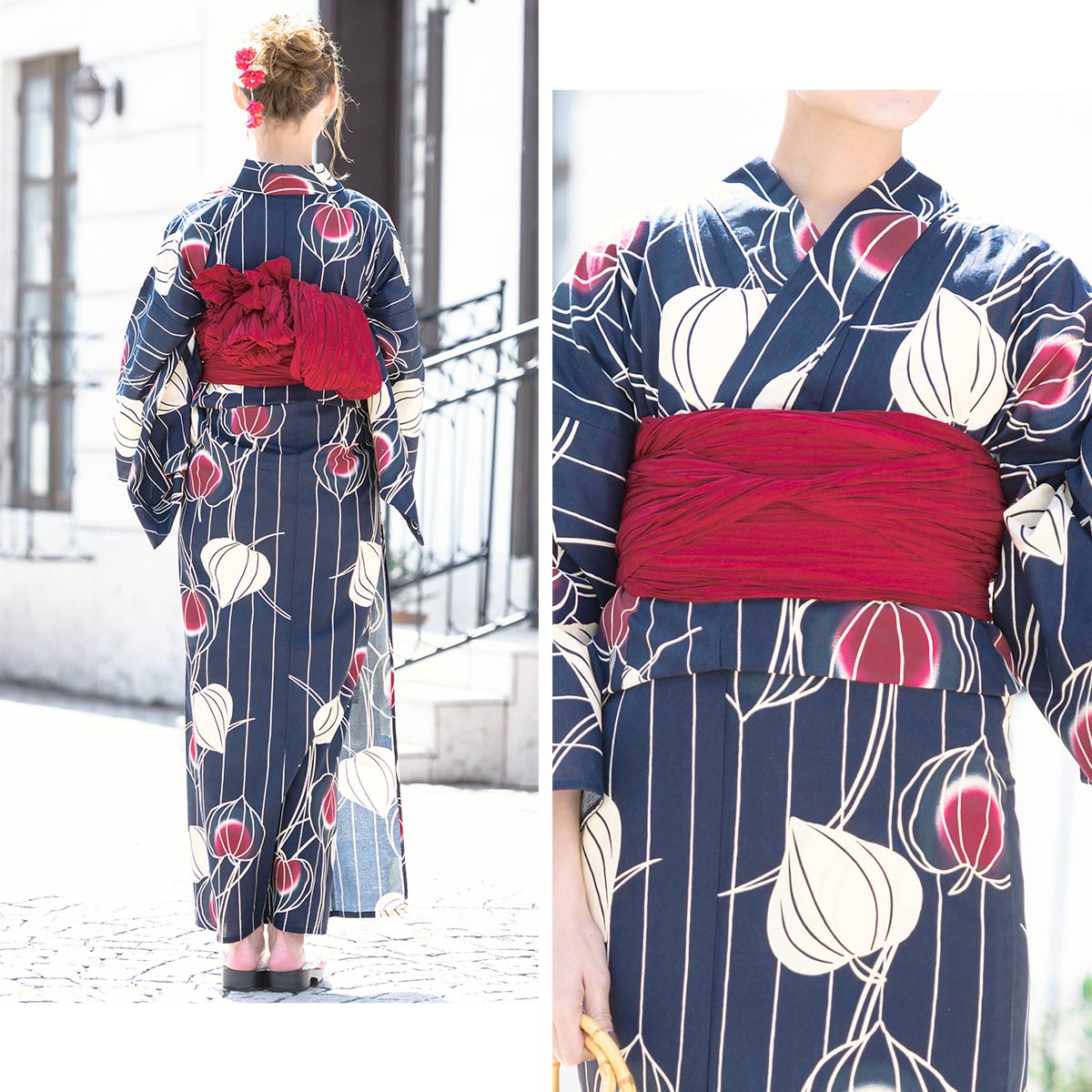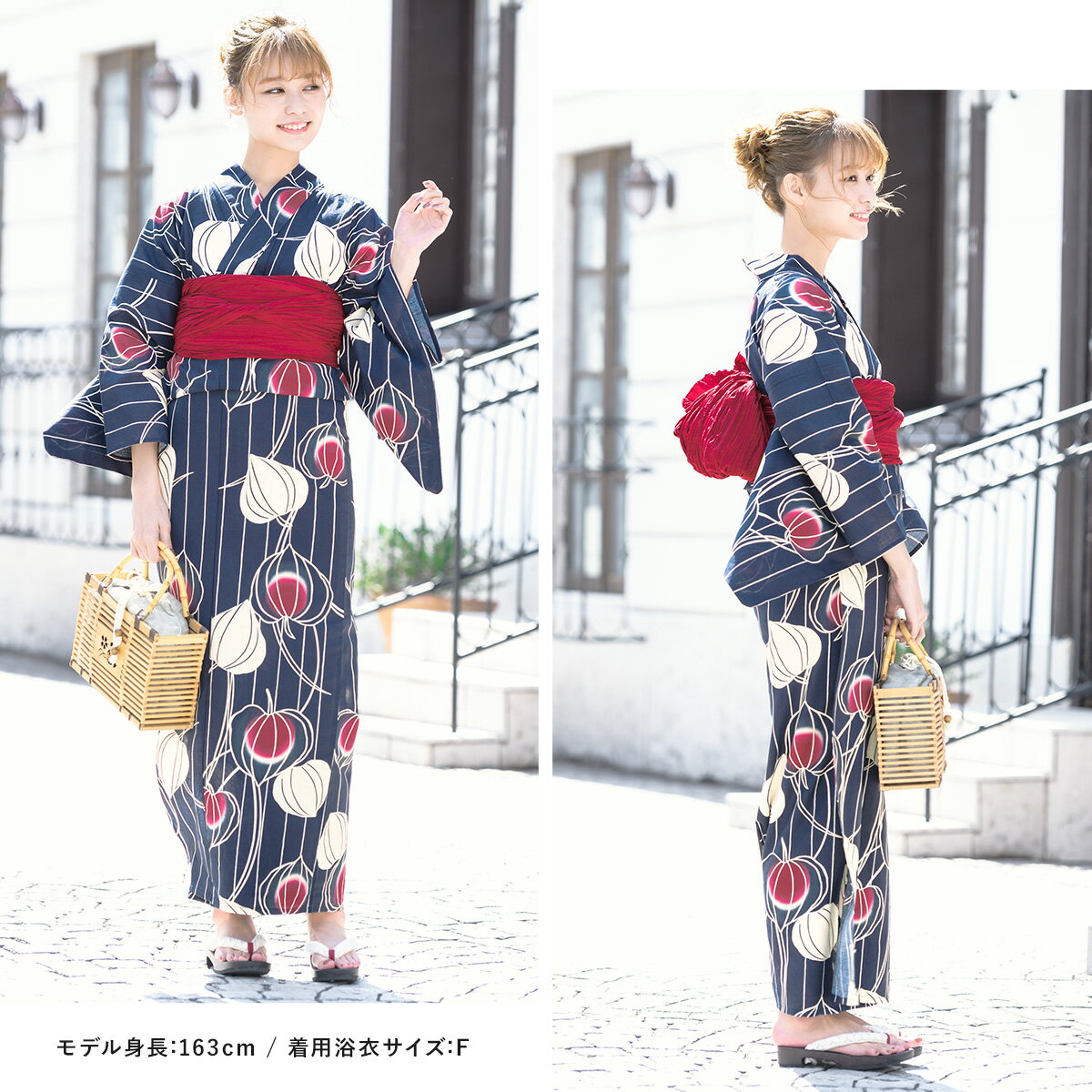 浴衣 セット レディース 2020 レトロ 浴衣セット 大人 3点セット 紺系 ネイビー 白 赤 鬼灯 ほおずき 縞 ストライプ 綿 女性 夏 フリー【あす楽対応】【送料無料】【浴衣 セット】