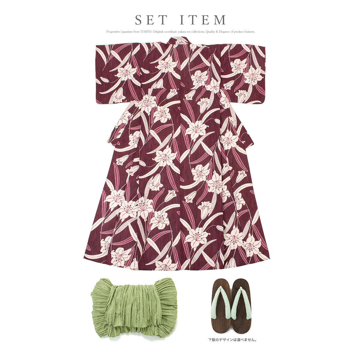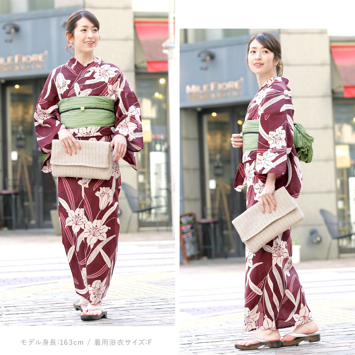 浴衣 セット レディース レトロ 浴衣セット 3点セット 赤系 レッド ベージュ 黒 百合 ユリ 花 雨縞 綿麻 兵児帯 女性 ボヌールセゾン マクレ 30代 40代 ママ 大人浴衣 フリー 【送料無料】【あす楽対応】