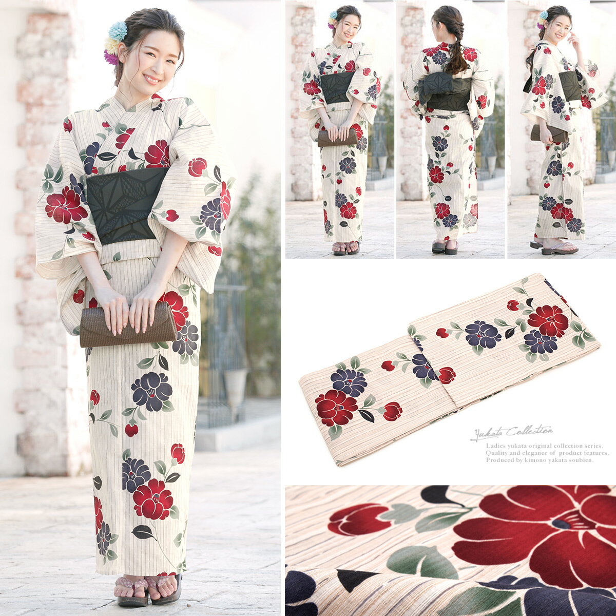 浴衣 セット レディース レトロ 浴衣セット 大人 3点セット ベージュ 茶系 紺 赤 黒 椿 つばき 花 縞 綿麻 兵児帯 女性 ボヌールセゾン フリー 【送料無料】【あす楽対応】